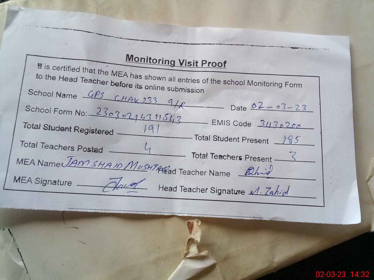 | Attendance Register | Head Teacher | MEA with School | Visit Proof |