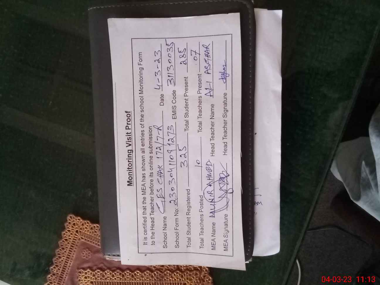 | Attendance Register | Head Teacher | MEA with School | Visit Proof |
