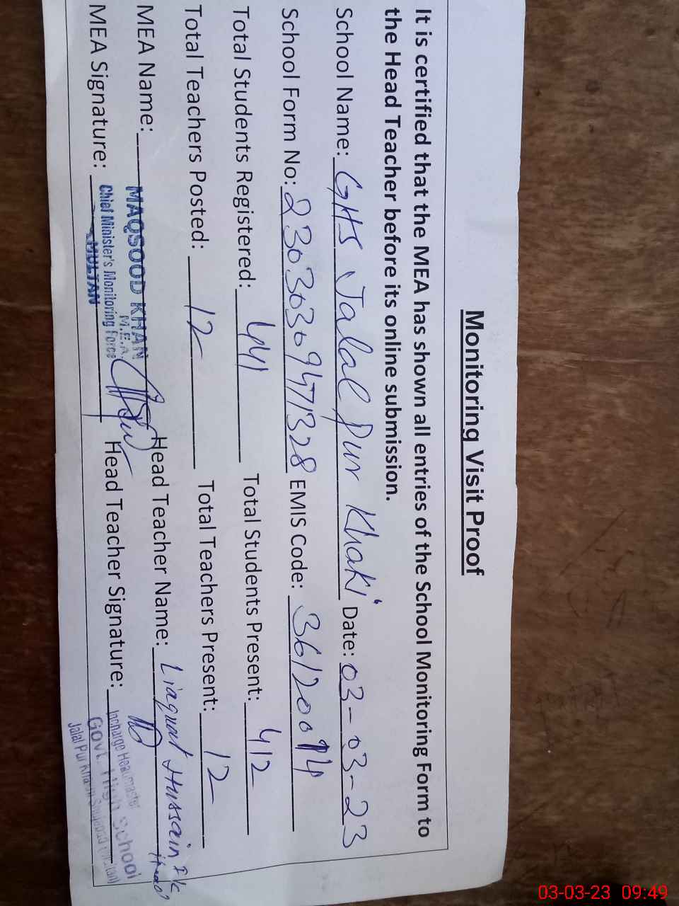 | Attendance Register | Head Teacher | MEA with School | Visit Proof |