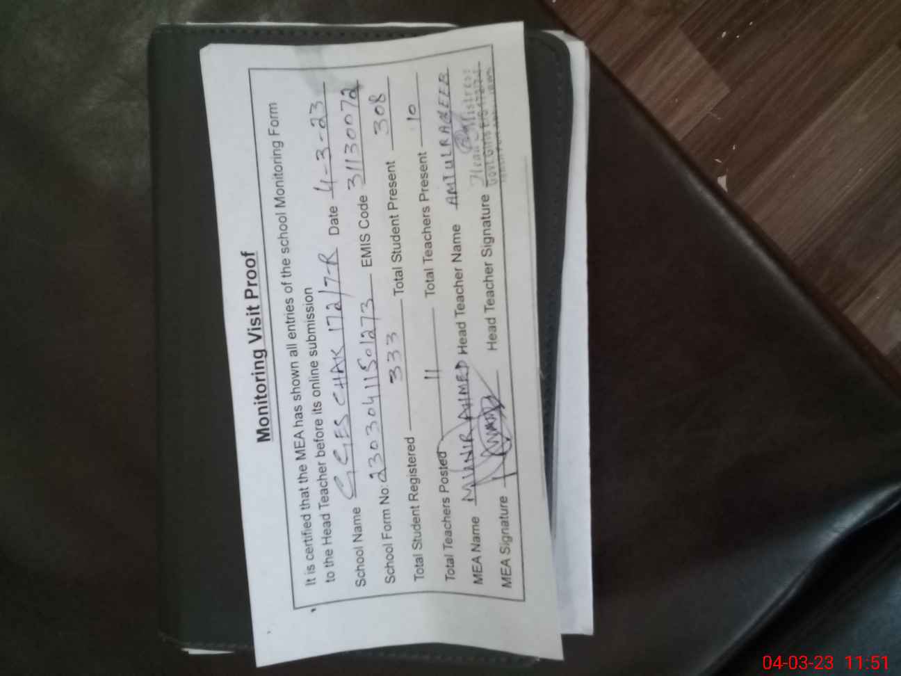 | Attendance Register | Head Teacher | MEA with School | Visit Proof |
