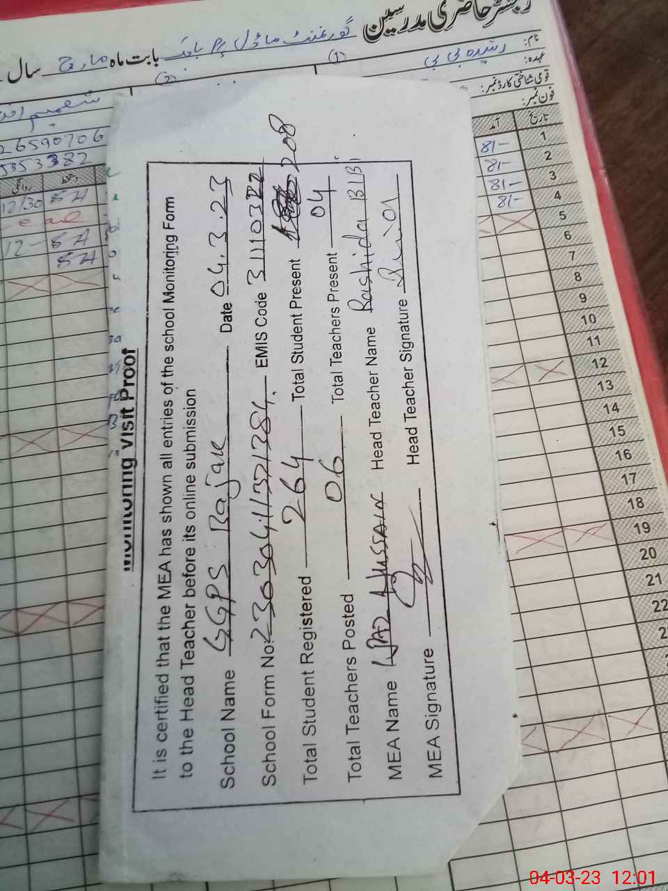 | Attendance Register | Head Teacher | MEA with School | Visit Proof |