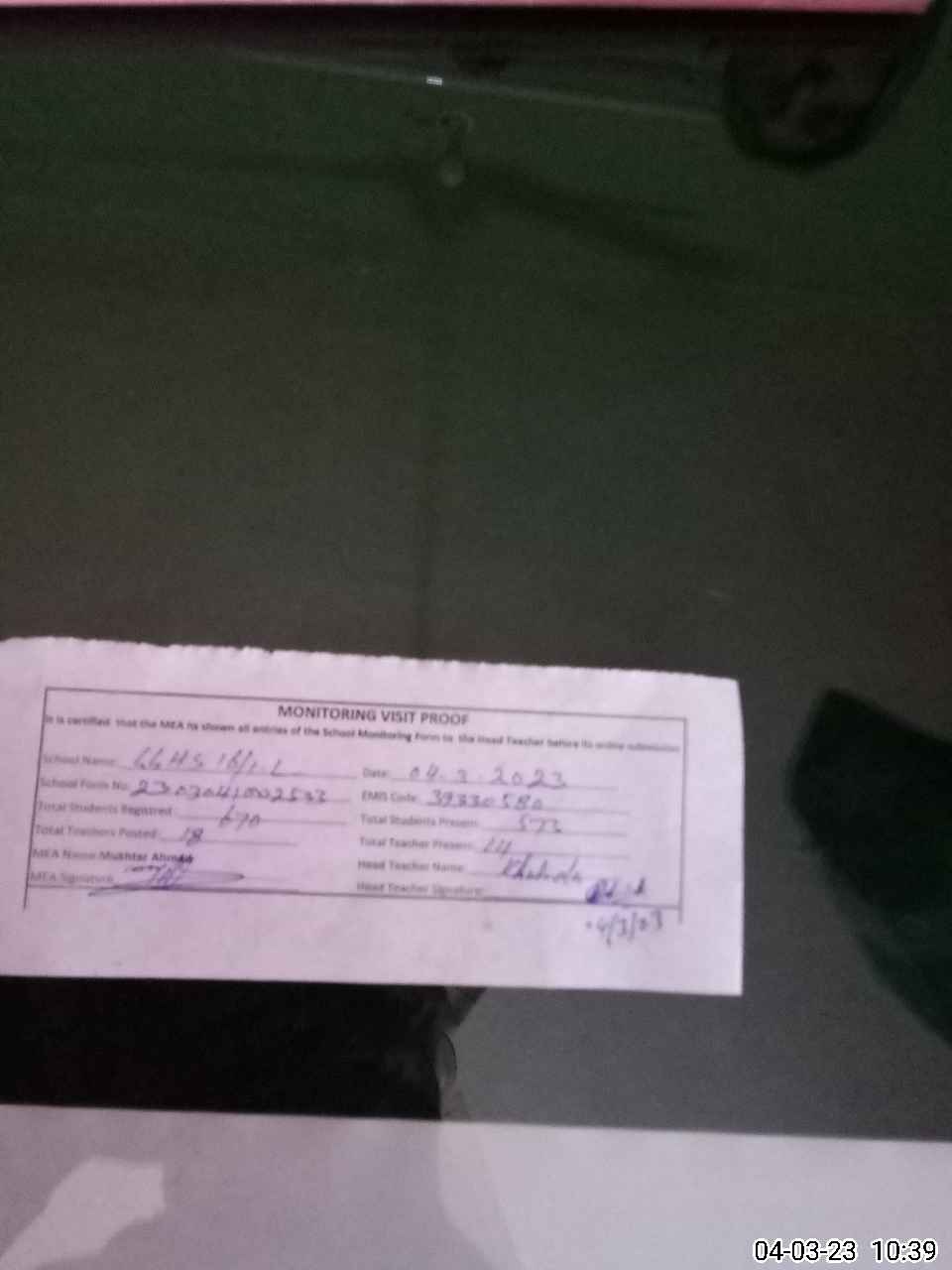 | Attendance Register | Head Teacher | MEA with School | Visit Proof |