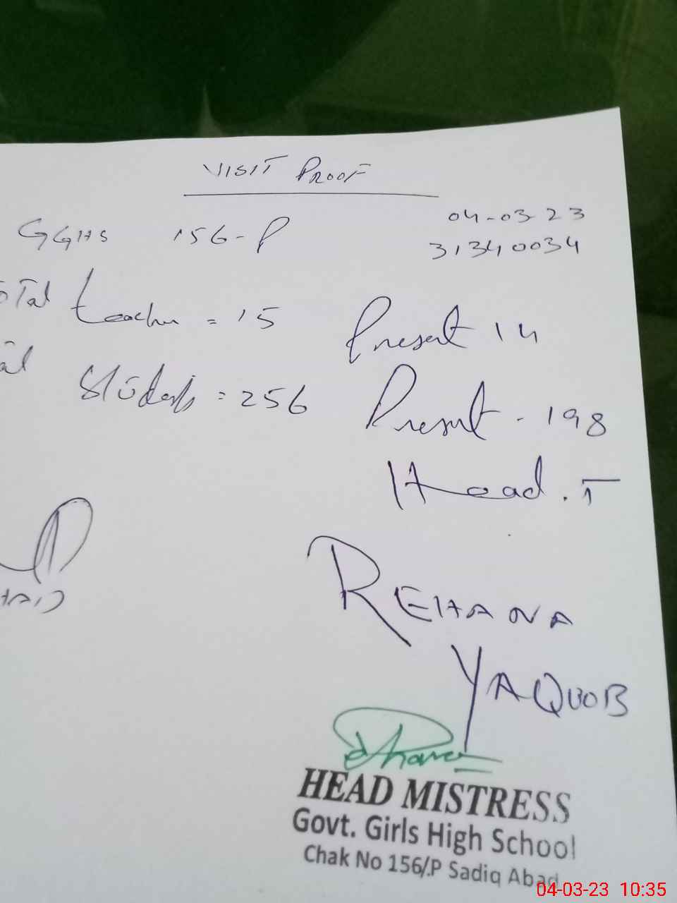 | EMIS Code: 31340034 | Name of School: GGHS CHAK NO. 156/P | |||
