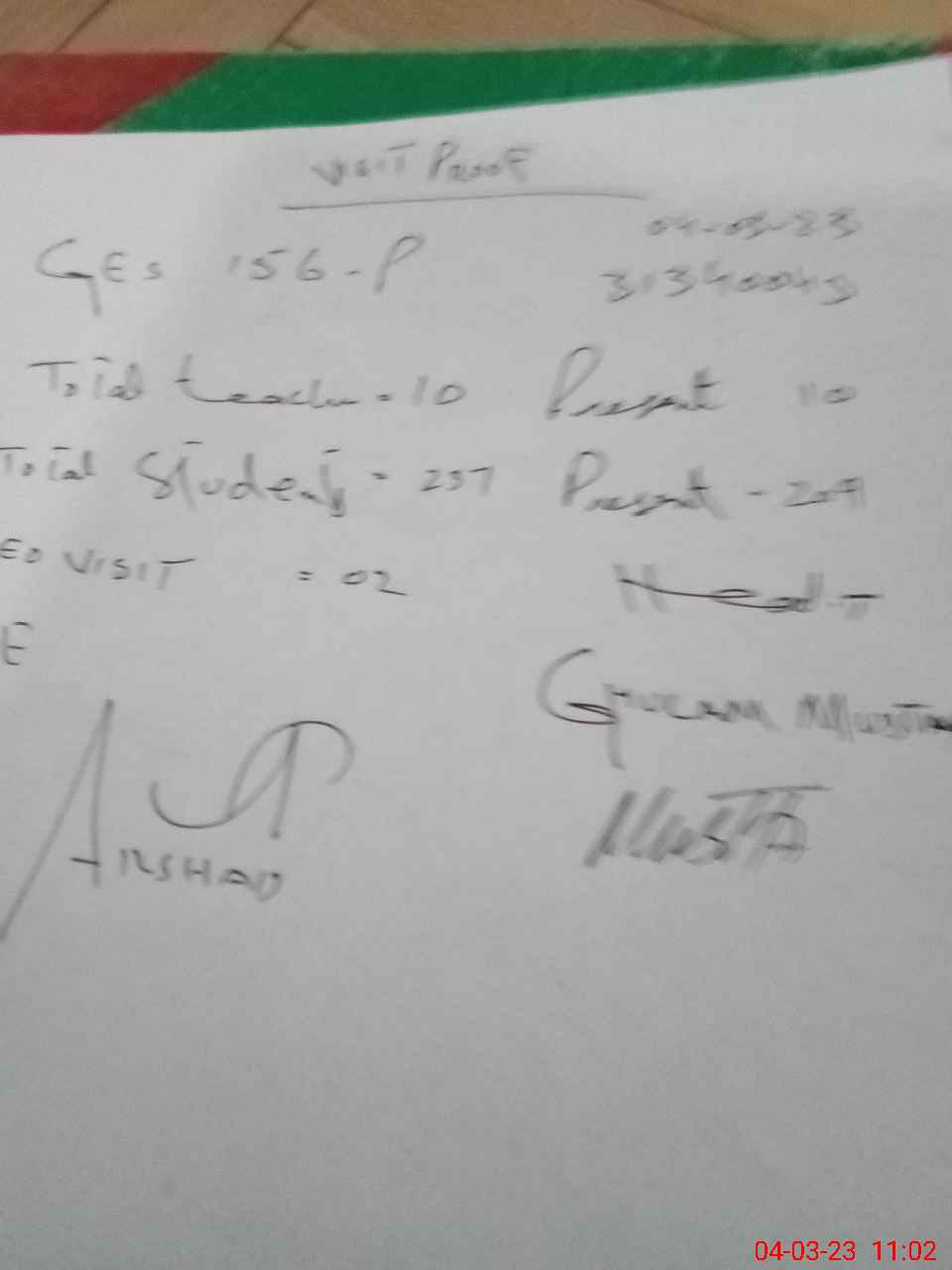 | Attendance Register | Head Teacher | MEA with School | Visit Proof |