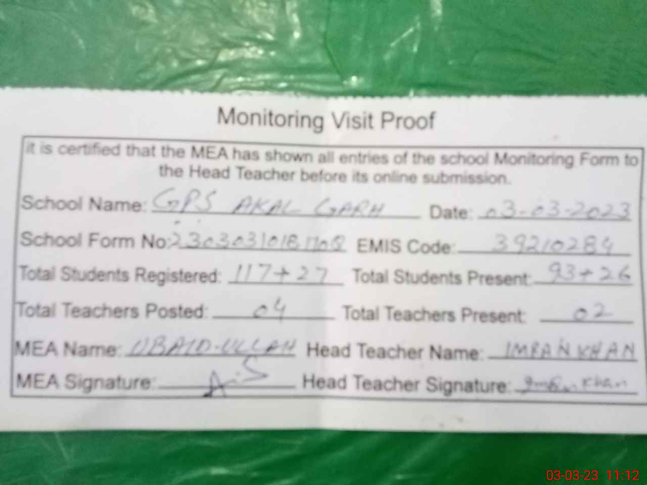 | Attendance Register | Head Teacher | MEA with School | Visit Proof |