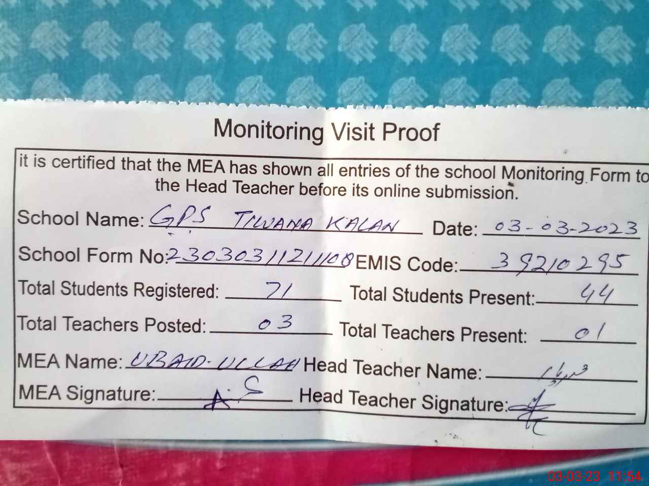 | EMIS Code: 39210295 | Name of School: GPS TIWANA KALAN | |||