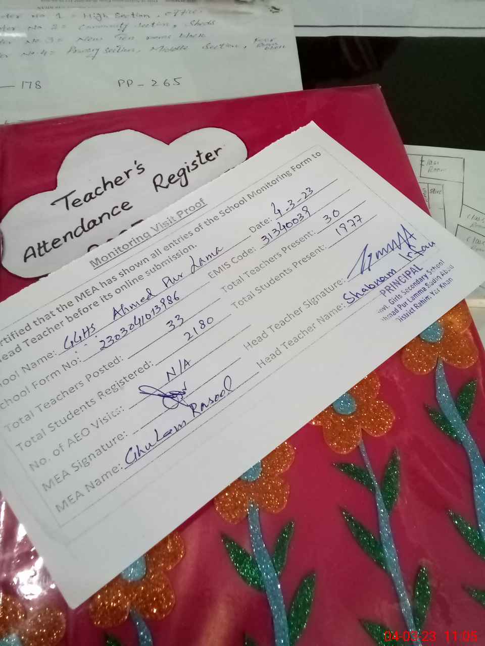 | Attendance Register | Head Teacher | MEA with School | Visit Proof |
