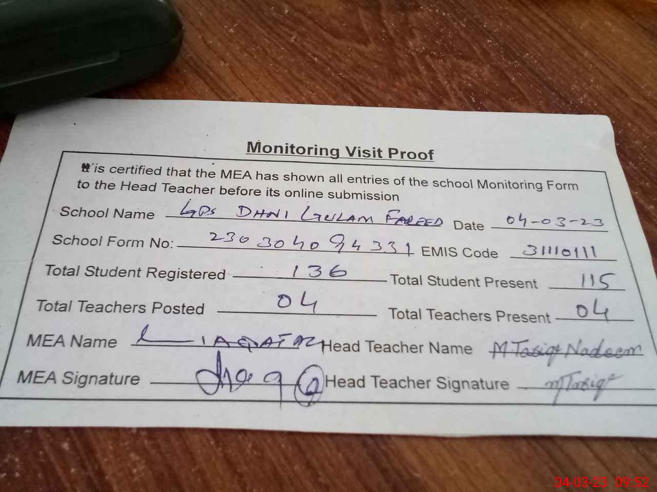 | Attendance Register | Head Teacher | MEA with School | Visit Proof |