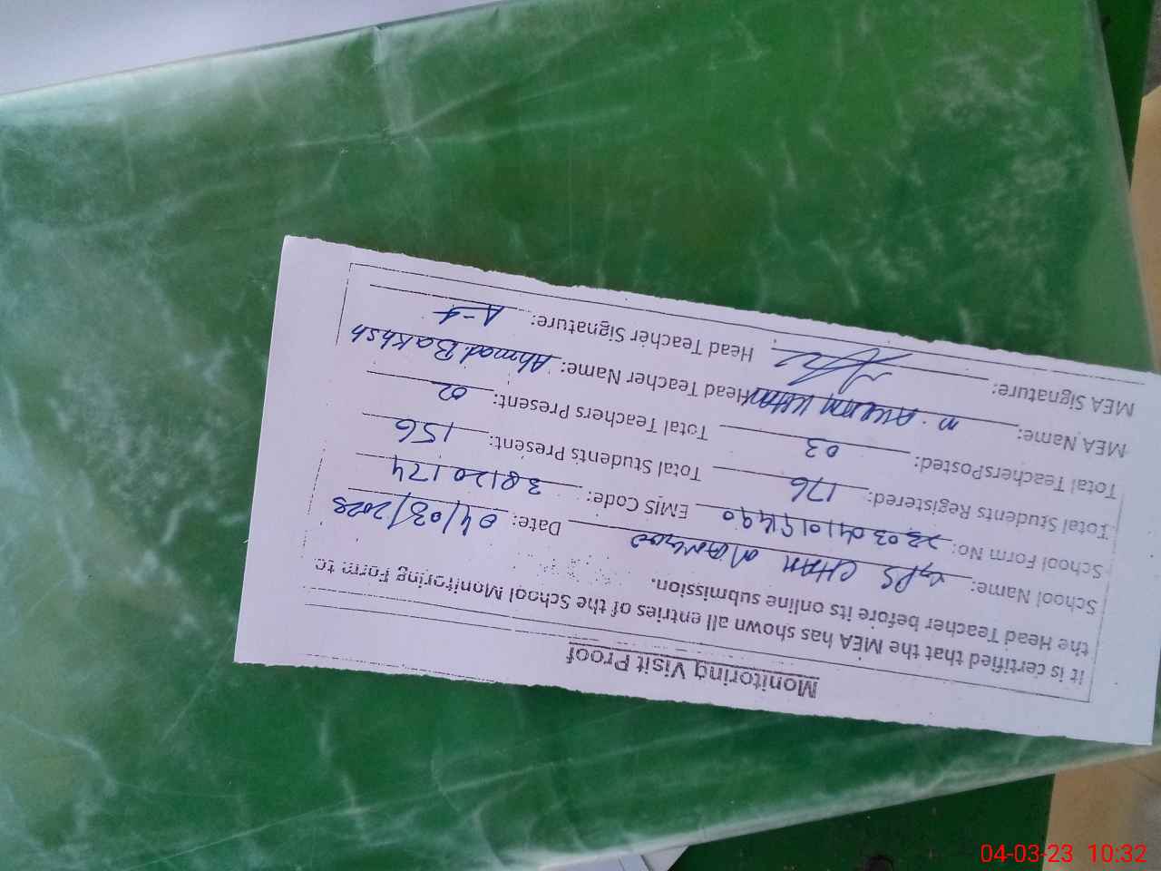 | Attendance Register | Head Teacher | MEA with School | Visit Proof |