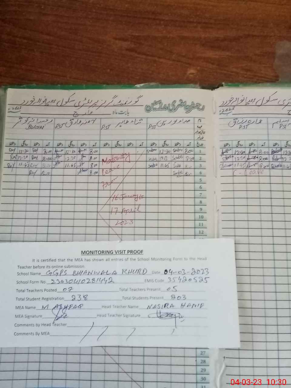 | Attendance Register | Head Teacher | MEA with School | Visit Proof |