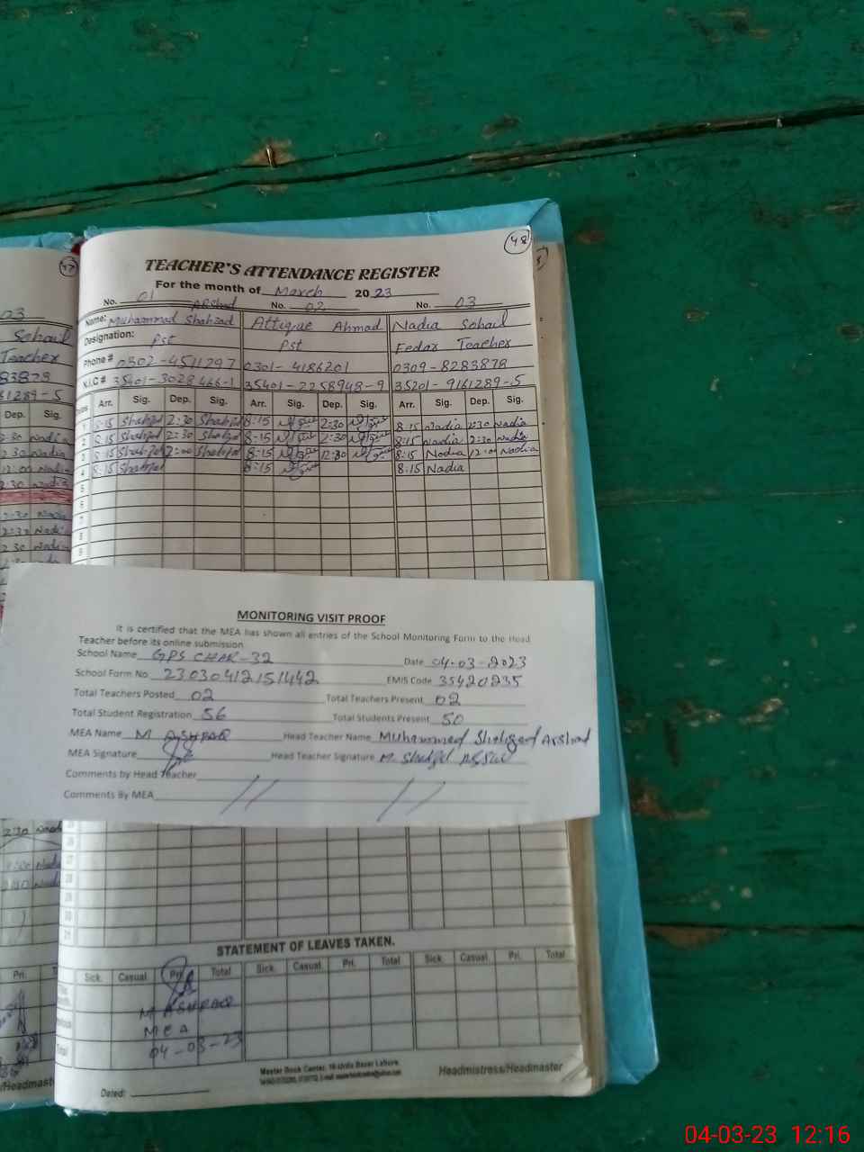 | Attendance Register | Head Teacher | MEA with School | Visit Proof |