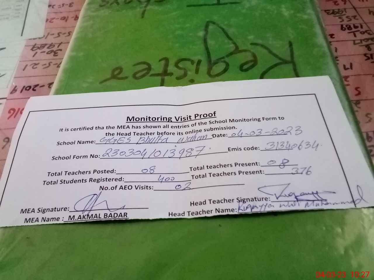 | Attendance Register | Head Teacher | MEA with School | Visit Proof |