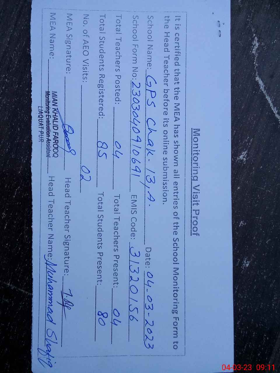 | Attendance Register | Head Teacher | MEA with School | Visit Proof |
