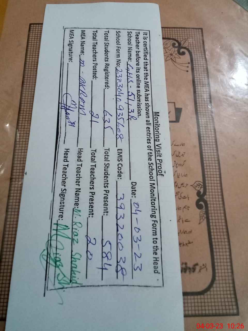 | EMIS Code: 39320038 | Name of School: GHS 51/3-R OKARA | |||