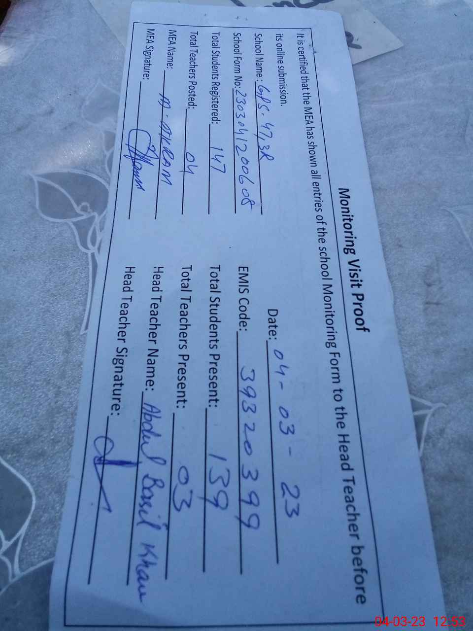 | EMIS Code: 39320399 | Name of School: GPS CHAK NO. 47/3-R | |||