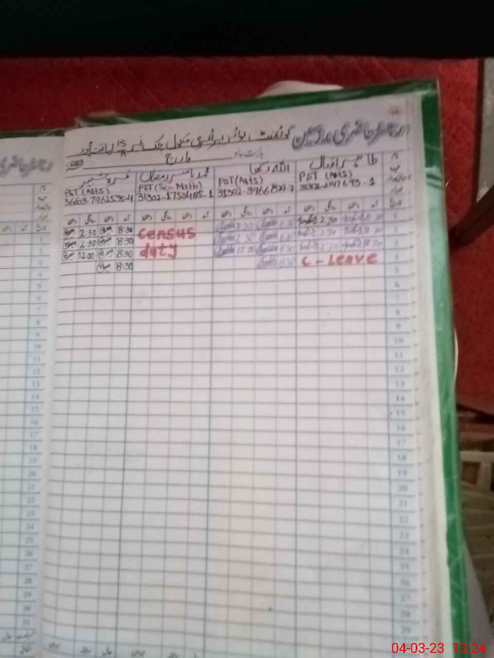 | Leave | Duty | Absent | Maternity | Medical | Ex- Pak |