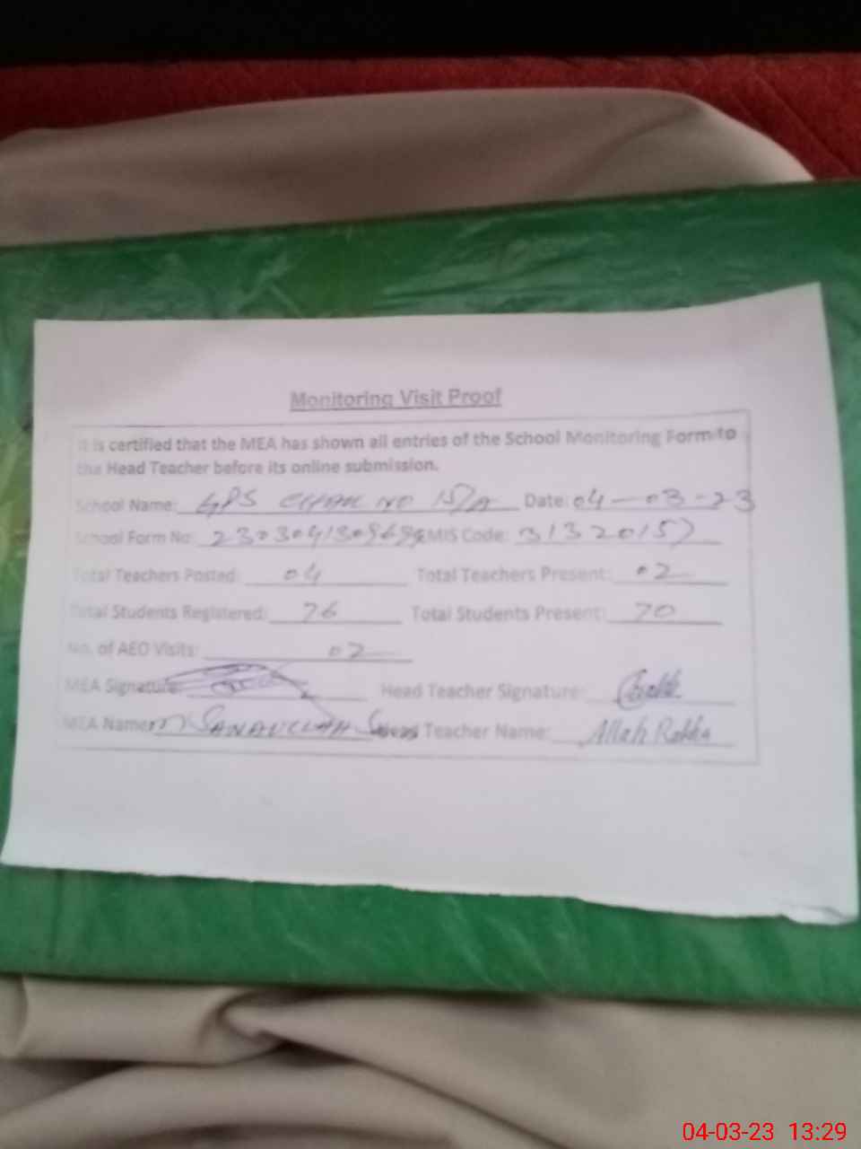 | Attendance Register | Head Teacher | MEA with School | Visit Proof |