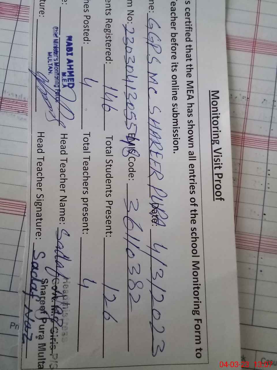 | Attendance Register | Head Teacher | MEA with School | Visit Proof |