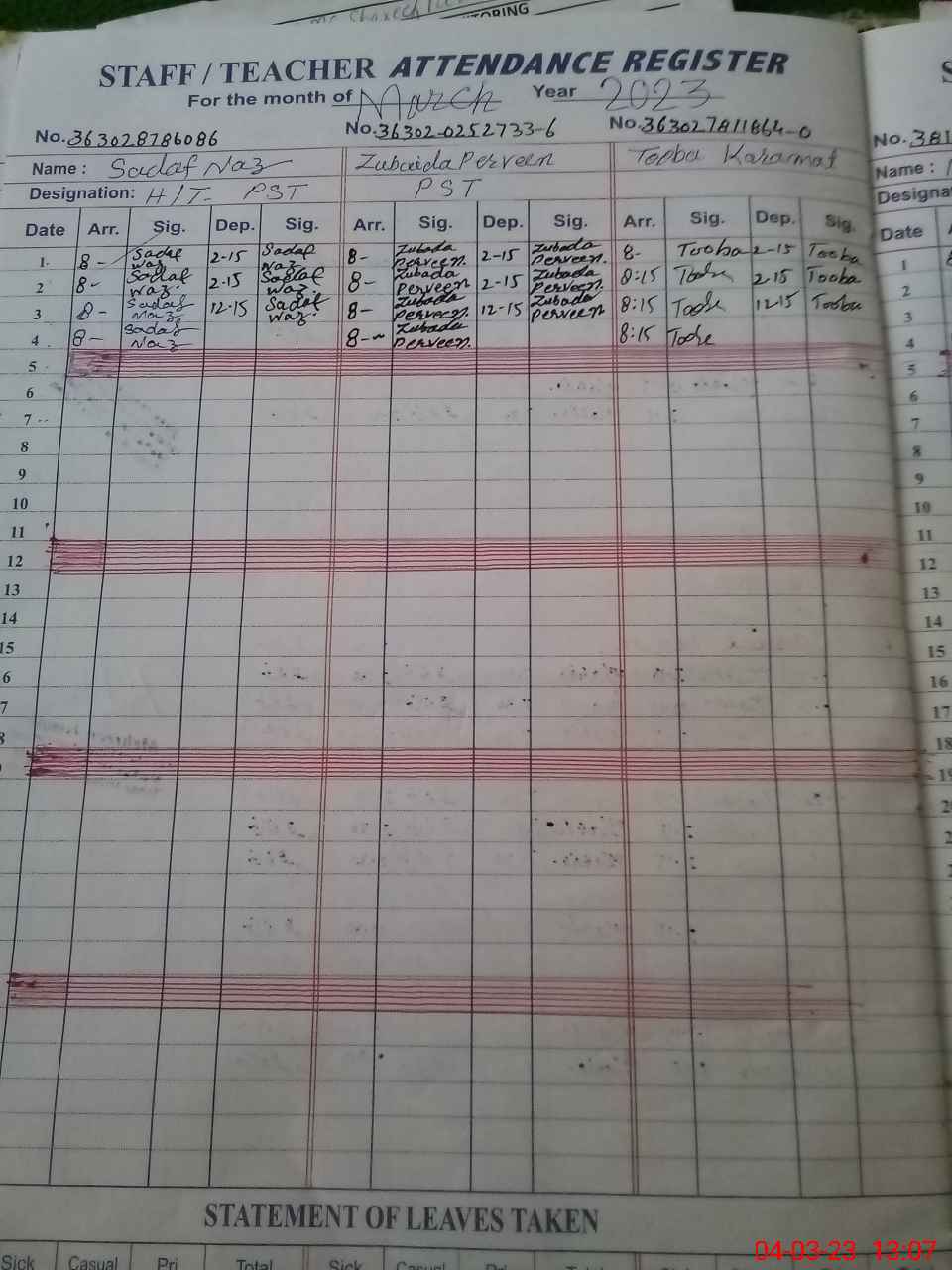 | CNIC | Full Name | Designation | R/C | Absence During Last Calender Month |