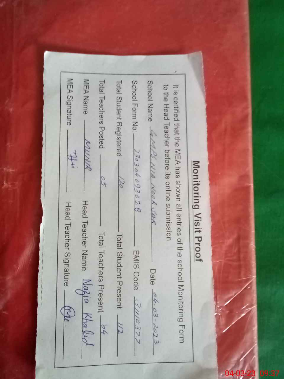 | Attendance Register | Head Teacher | MEA with School | Visit Proof |