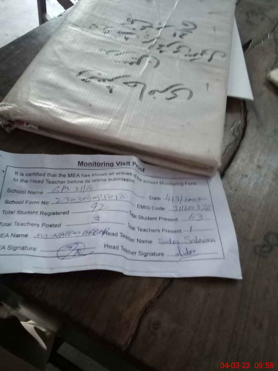| Attendance Register | Head Teacher | MEA with School | Visit Proof |
