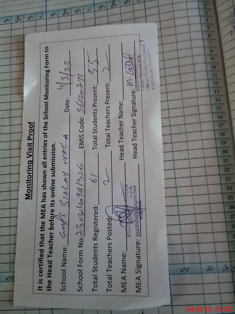 | Attendance Register | Head Teacher | MEA with School | Visit Proof |