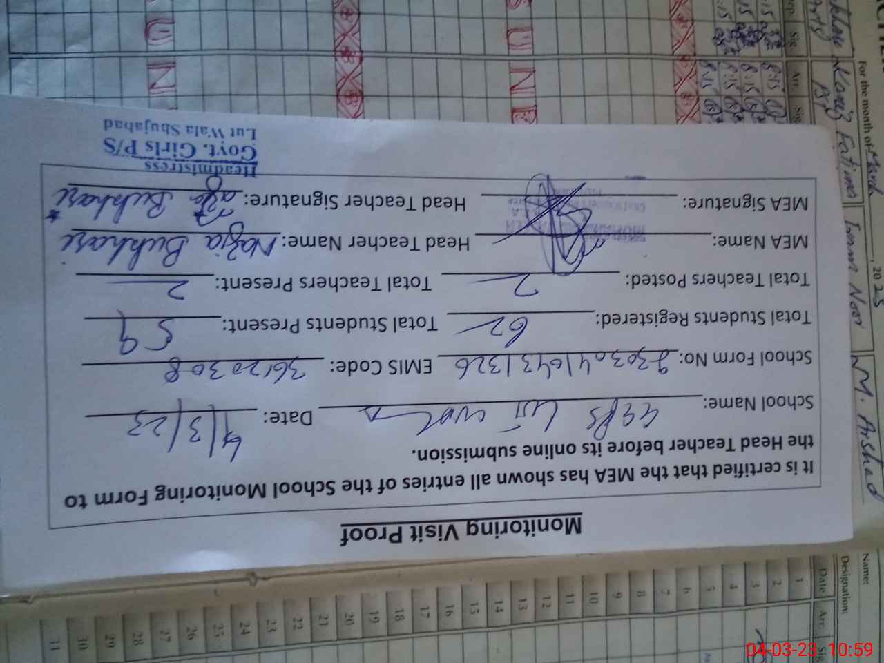 | Attendance Register | Head Teacher | MEA with School | Visit Proof |