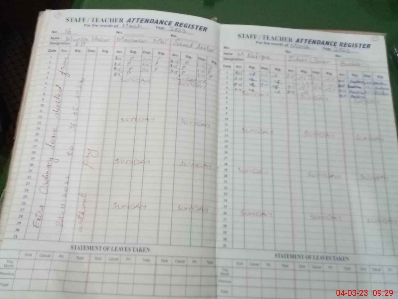 | Leave | Duty | Absent | Maternity | Medical | Ex- Pak |