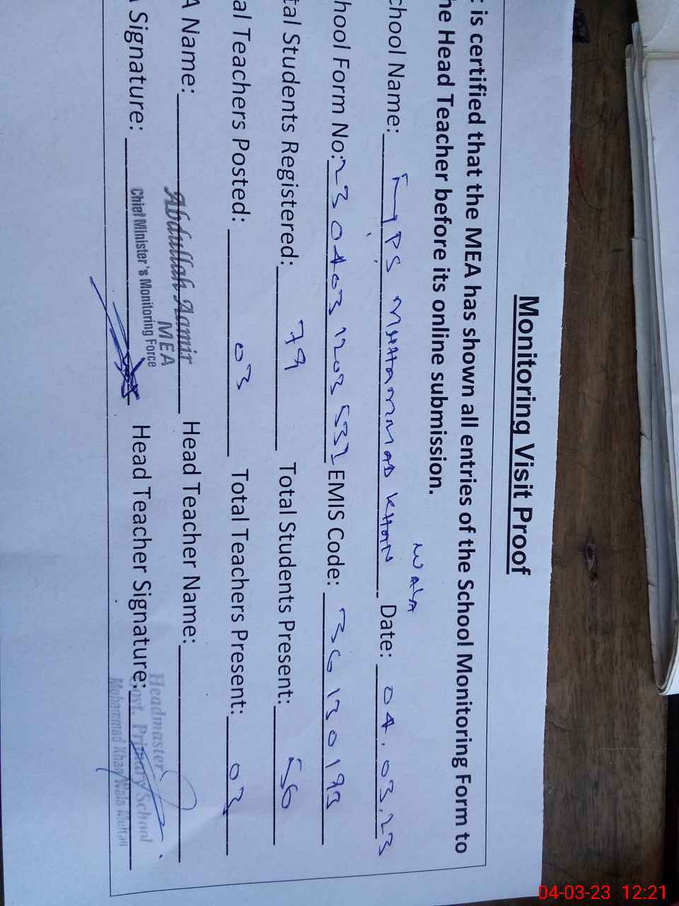 | Attendance Register | Head Teacher | MEA with School | Visit Proof |