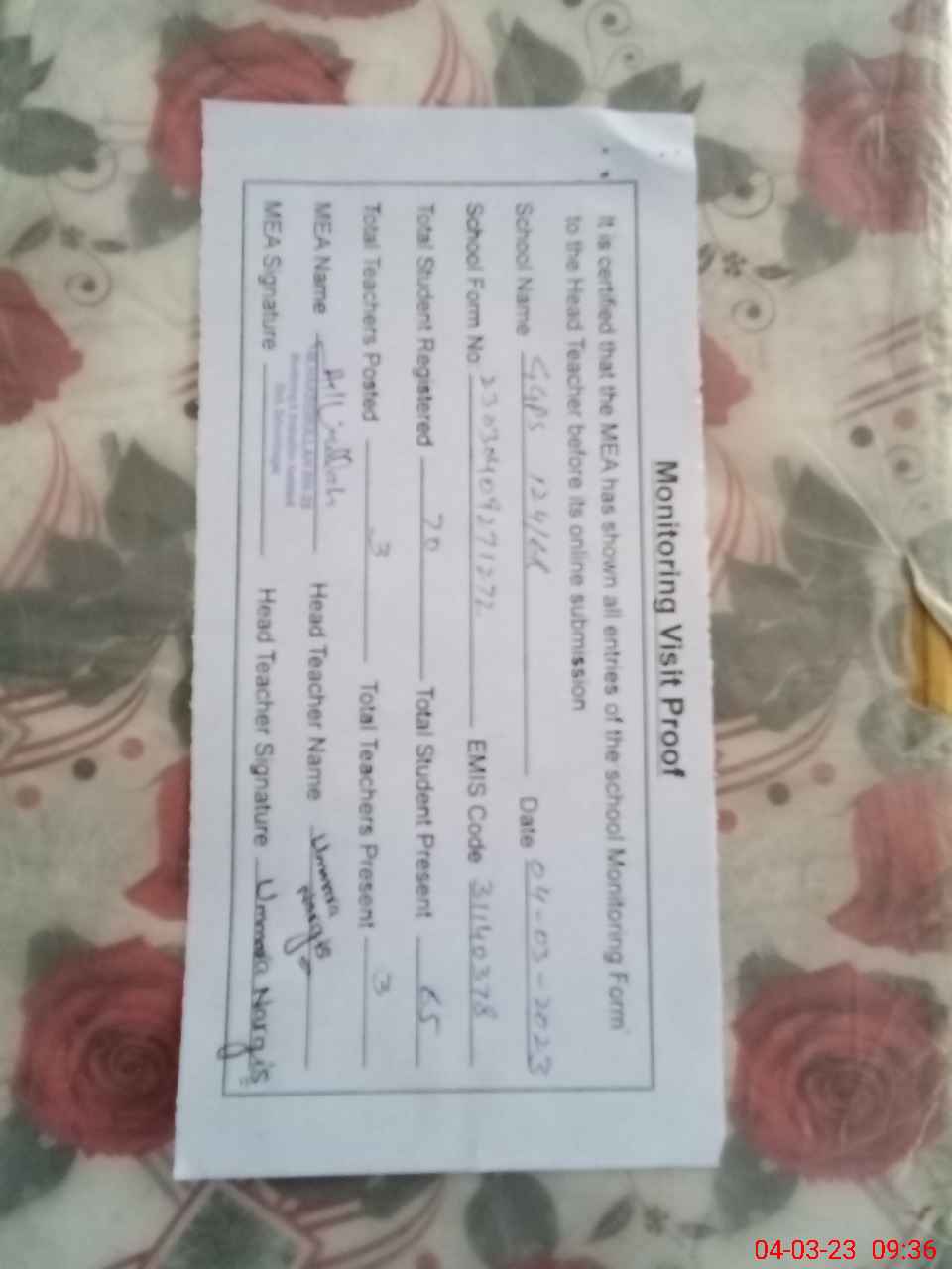 | Attendance Register | Head Teacher | MEA with School | Visit Proof |