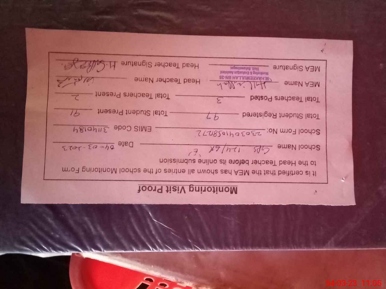 | Attendance Register | Head Teacher | MEA with School | Visit Proof |