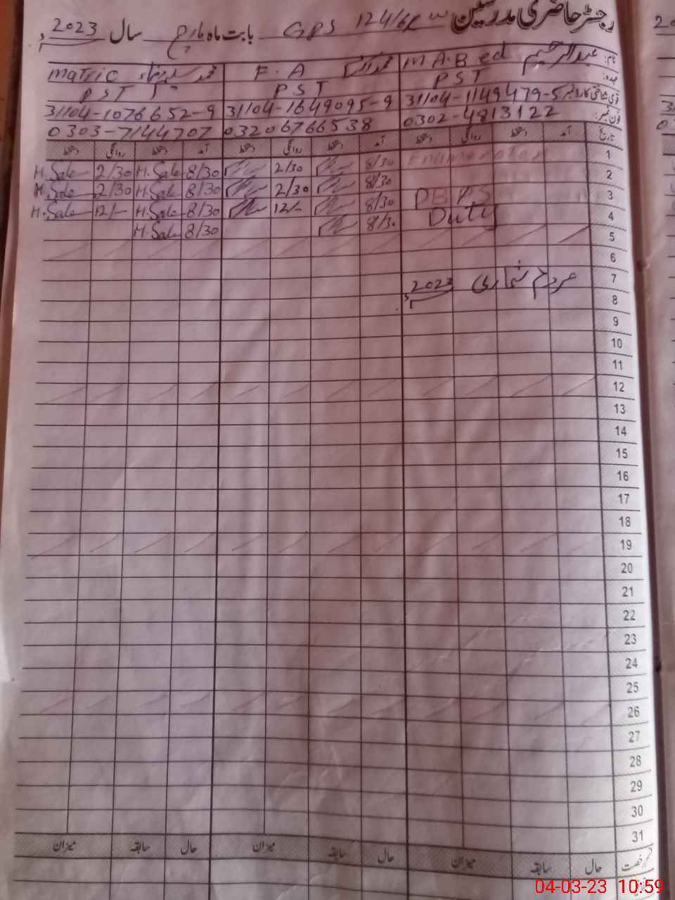 | CNIC | Full Name | Designation | R/C | Absence During Last Calender Month |