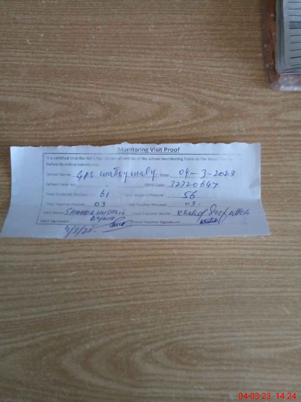 | Attendance Register | Head Teacher | MEA with School | Visit Proof |