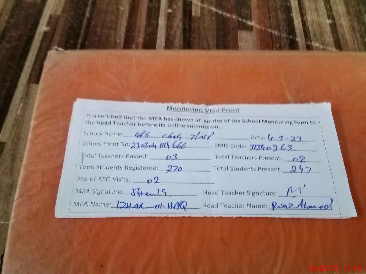 | Attendance Register | Head Teacher | MEA with School | Visit Proof |