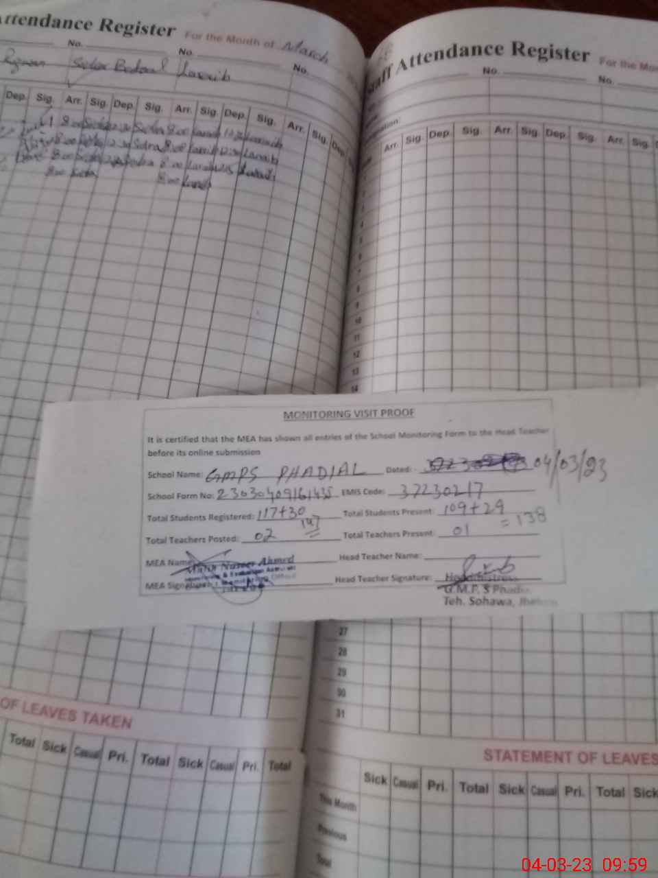 | Attendance Register | Head Teacher | MEA with School | Visit Proof |