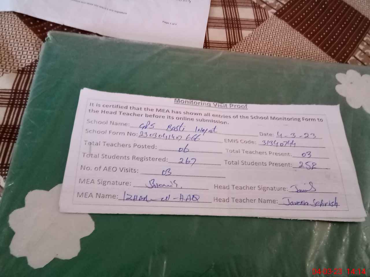 | Attendance Register | Head Teacher | MEA with School | Visit Proof |