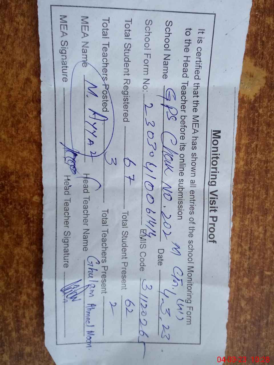 | EMIS Code: 31120265 | Name of School: GPS CHAK NO. 202/M (W) | |||