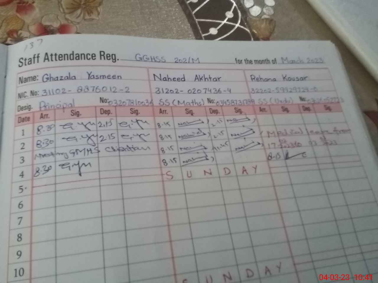 | CNIC | Full Name | Designation | R/C | Absence During Last Calender Month |