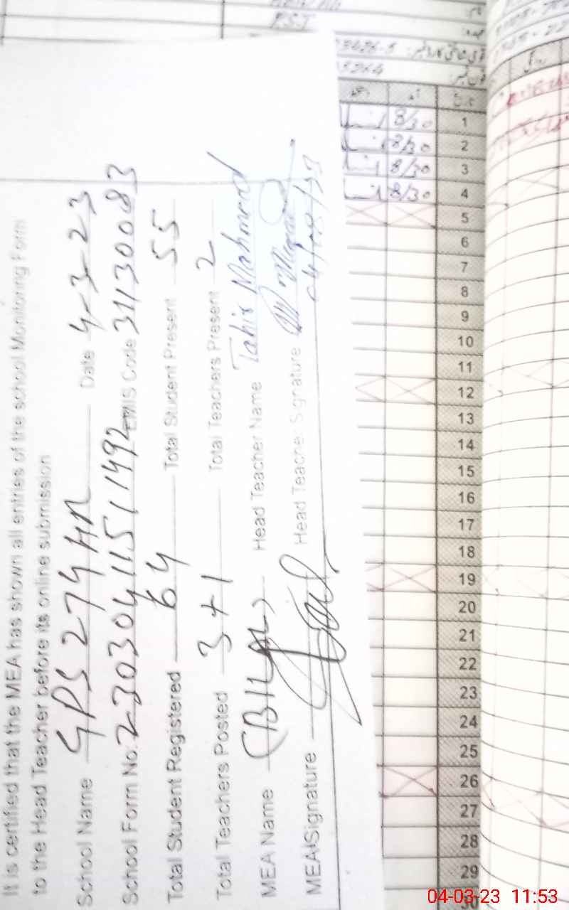| EMIS Code: 31130083 | Name of School: GPS CHAK NO.274/HR | |||