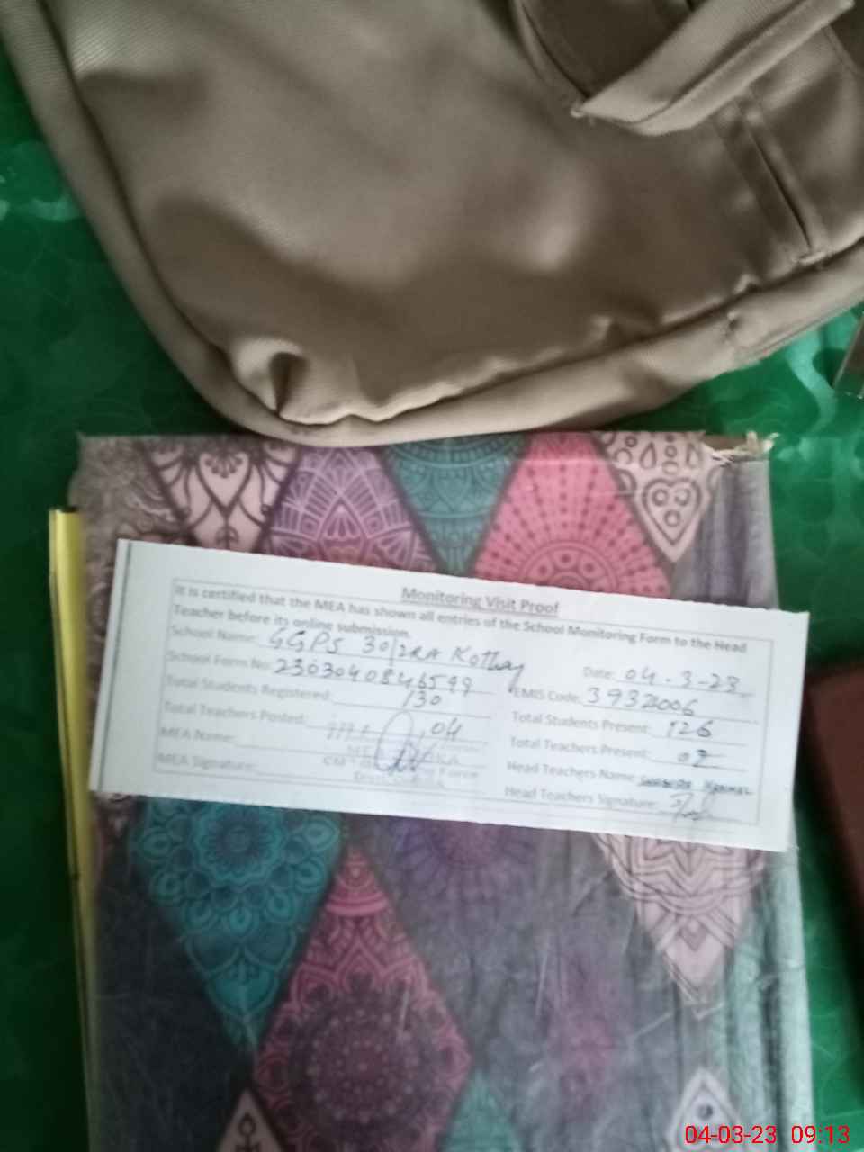 | Attendance Register | Head Teacher | MEA with School | Visit Proof |