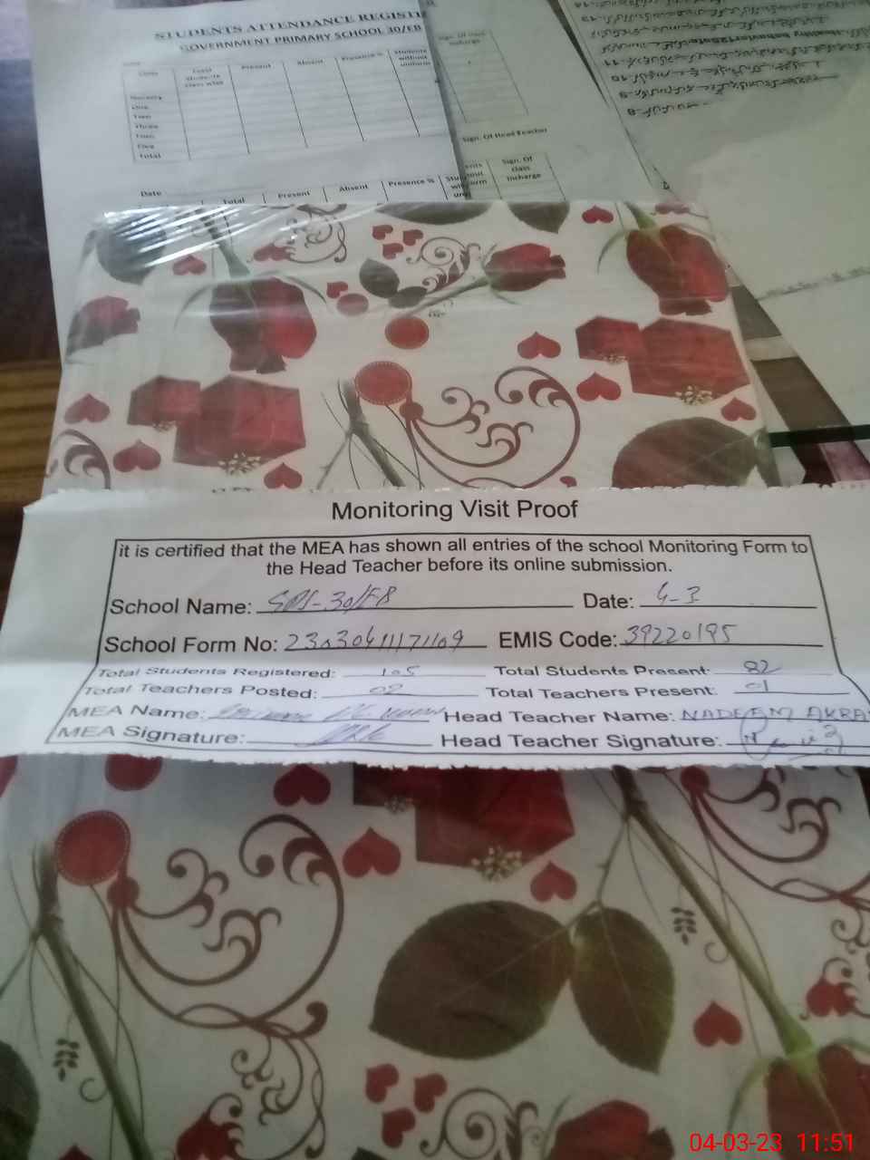 | Attendance Register | Head Teacher | MEA with School | Visit Proof |