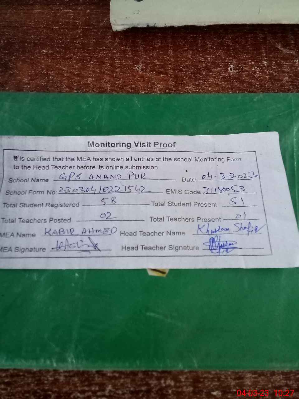 | Attendance Register | Head Teacher | MEA with School | Visit Proof |