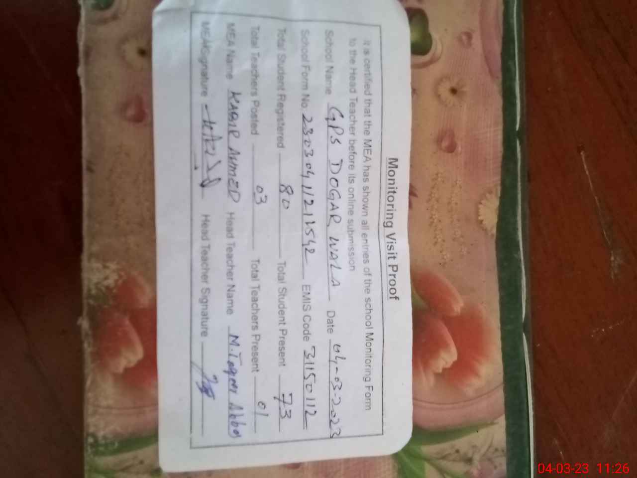 | EMIS Code: 31150112 | Name of School: GPS DOGAR WALA | |||