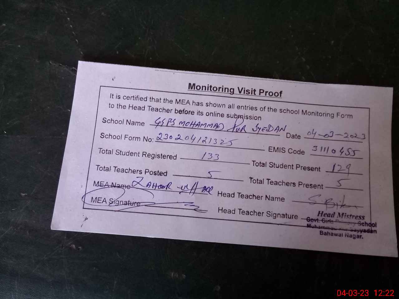 | Attendance Register | Head Teacher | MEA with School | Visit Proof |