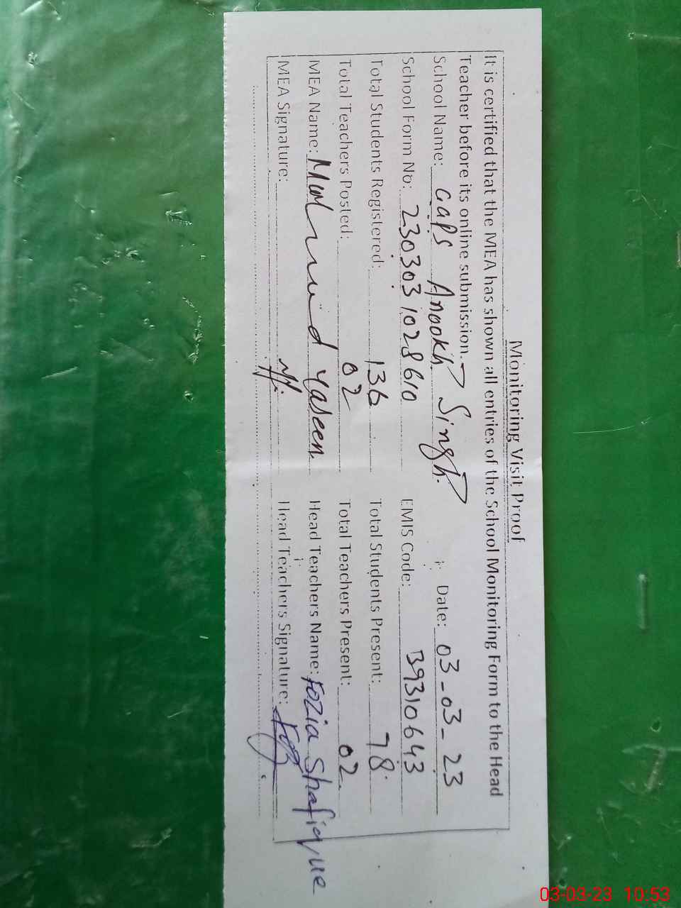 | Attendance Register | Head Teacher | MEA with School | Visit Proof |