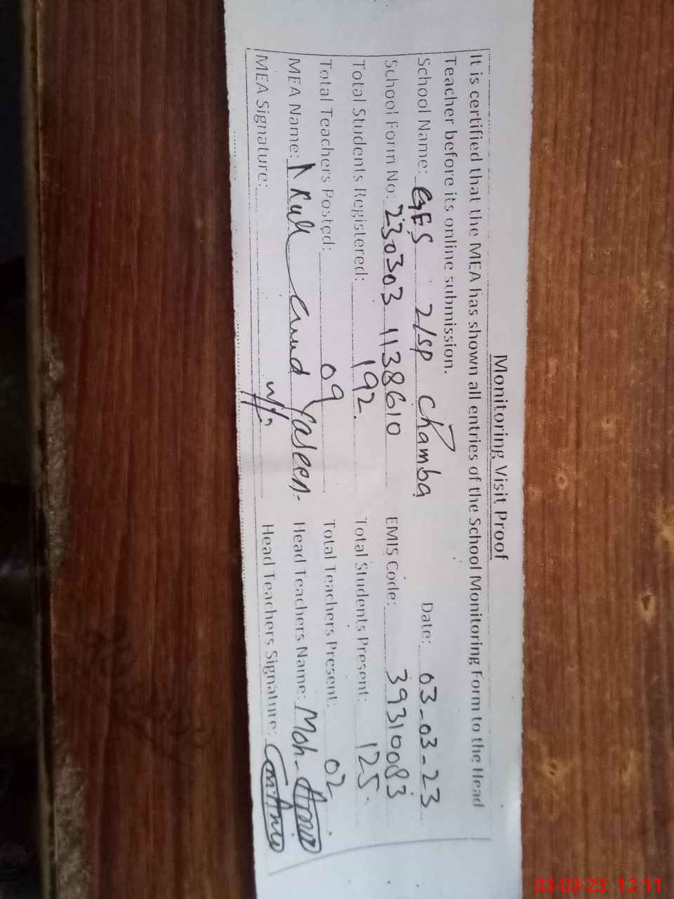 | Attendance Register | Head Teacher | MEA with School | Visit Proof |