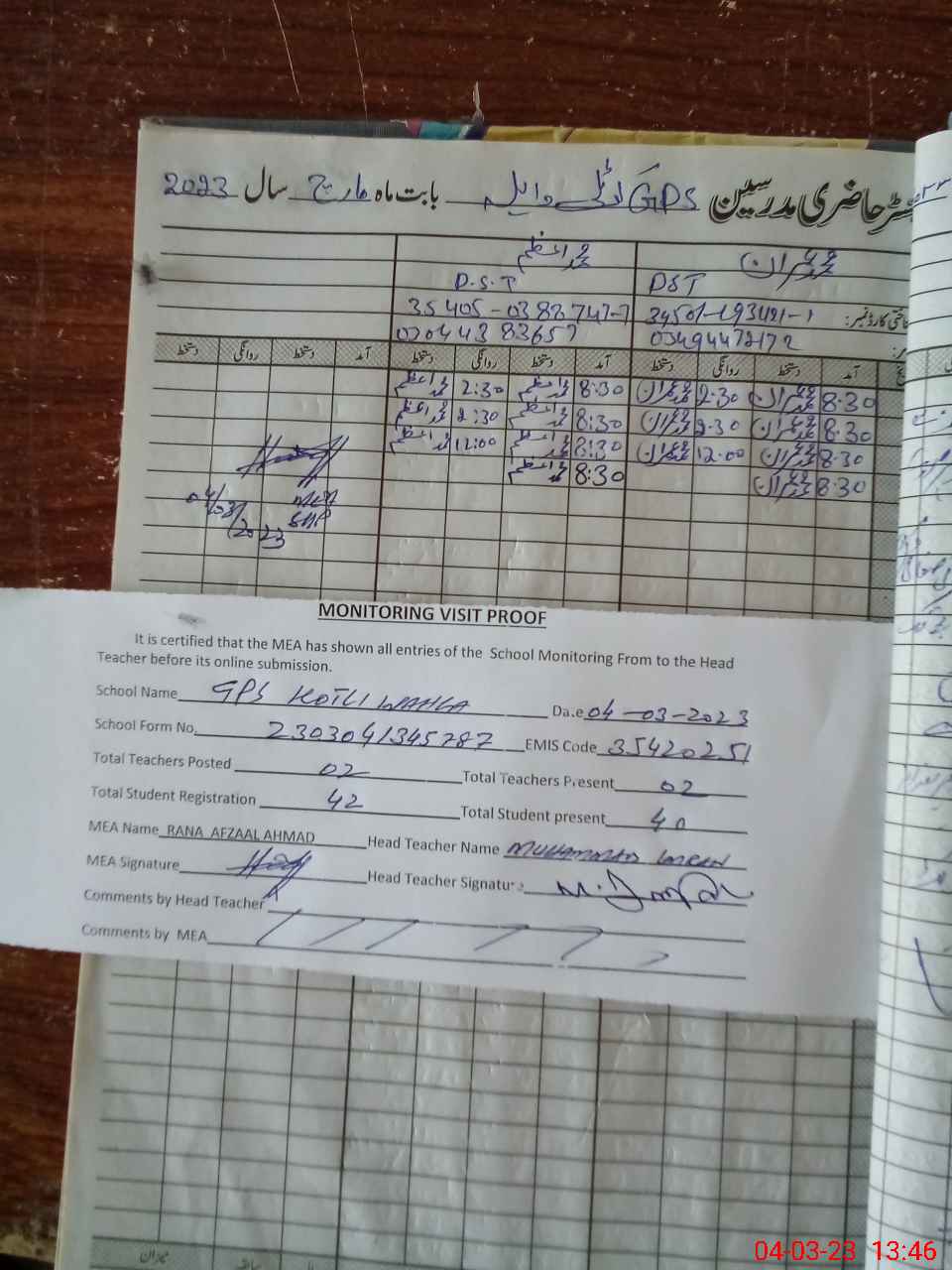 | Attendance Register | Head Teacher | MEA with School | Visit Proof |