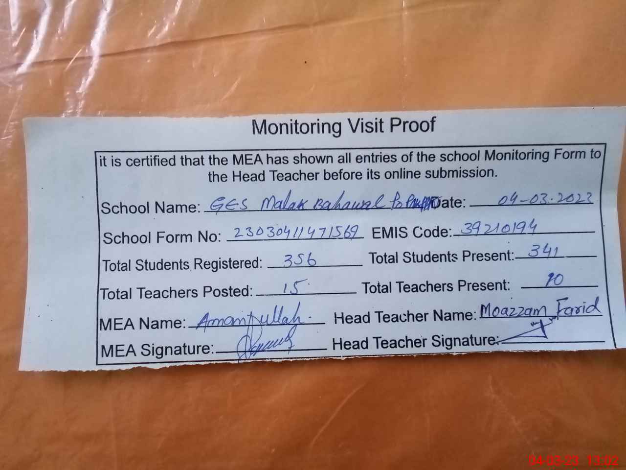 | EMIS Code: 39210194 | Name of School: GES MALIK BAHAWAL PO PAKPATTAN | |||