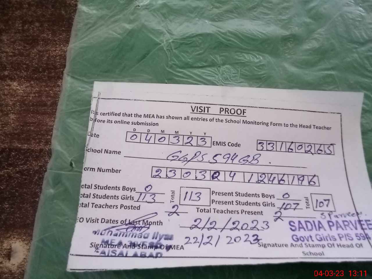 | Attendance Register | Head Teacher | MEA with School | Visit Proof |