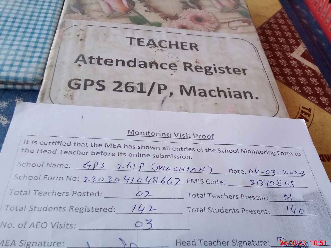 | Attendance Register | Head Teacher | MEA with School | Visit Proof |